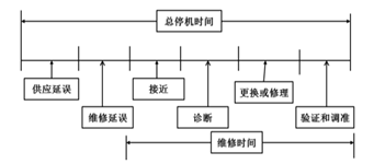 设备可维修性研究同样基于对典型故障的可靠性的认知及现有维修水平的研究。可维修性的典型技术指标是平均修理时间(MTTR)。下图显示了维修时间的构成。