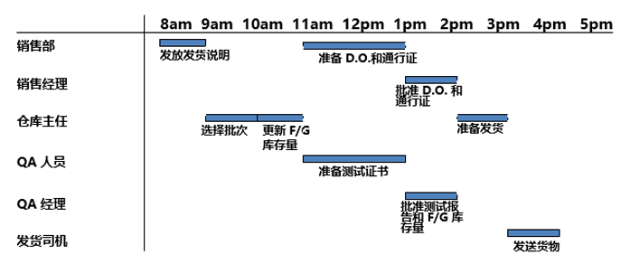 这张流程图不仅显示了活动步骤、责任主体、还标识了每个步骤所需的用时,对于六西格玛项目的时间绩效衡量会有很大的帮助。