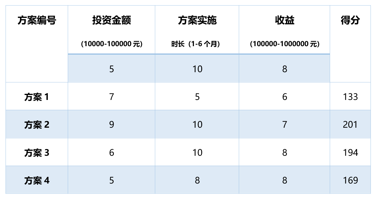 首先,小组确定了评价方案的3个维度及评价标准:投资金额(10000-100000元)、方案实施时长(1-6个月)、收益(100000-1000000)。