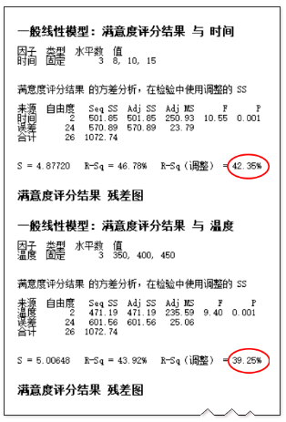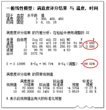 结论:”温度”和”时间”能够解释89.02%的满意度评分结果。
