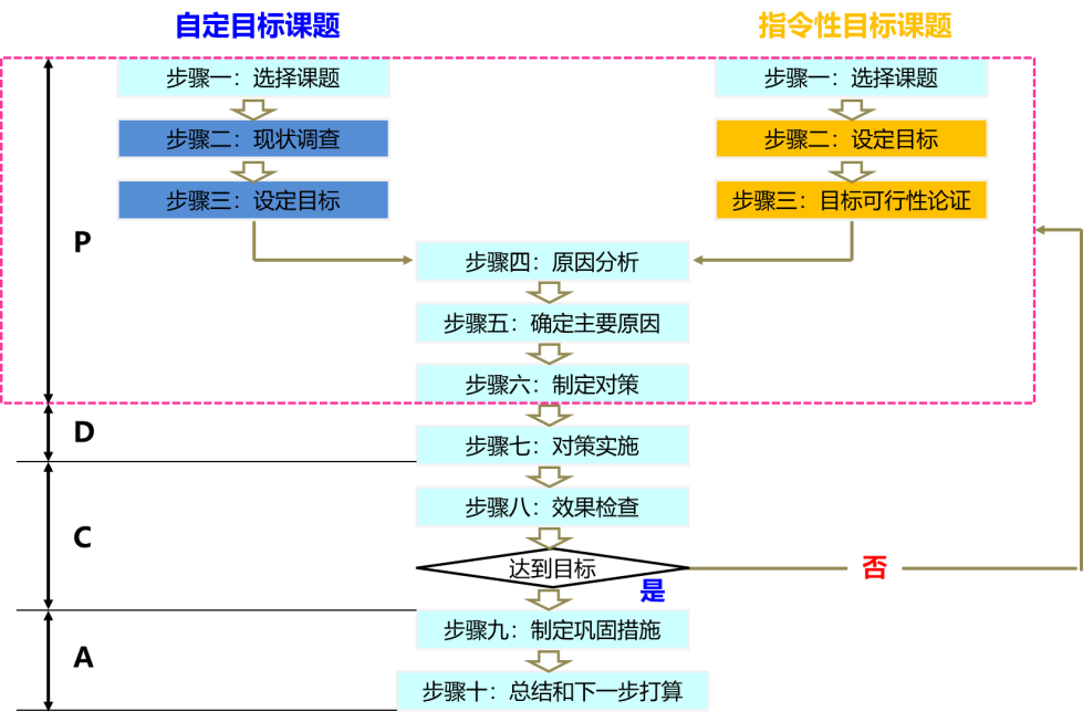 1. 检查小组设定的课题目标是否完成,达成目标后进入第九个步骤制定巩固措施;如果没达成目标,需要再回到P阶段,见图一:问题解决型课题活动步骤;