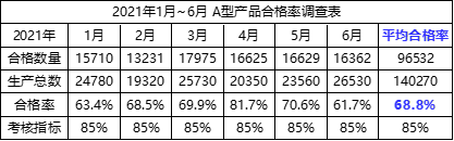 1)用调查表收集2021年1月到6月A型产品合格率,平均合格率为68.8%;