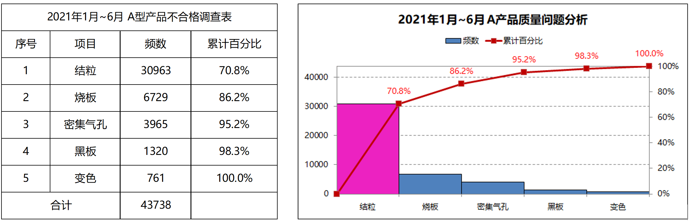 2)用帕累托图调查不合格主要因素为产品结粒,不良比率为70.8%;