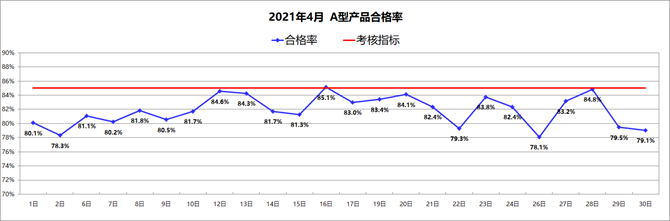 2) 公司设定的目标为85%,4月份整体合格率高,平均为81.7%,且有5次合格率在84%以上,有1次达到了85%;