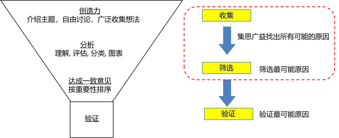 目标设定后,就可以开始原因分析了,原因分析的思路如下图,像漏斗一样,先找可能的原因,再筛选出最可能的原因,验证这些最可能的原因是否是问题的主要原因。