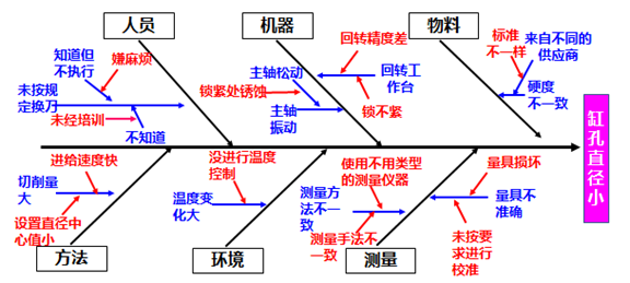 从因果图看到,缸孔直径小是问题(结果),通过因果图的人机料法环测展开分析,红色的字为末端因素(原因)。在QCC小组活动中,要求要把所有的末端因素进行验证,找出影响缸孔直径小的主要原因。