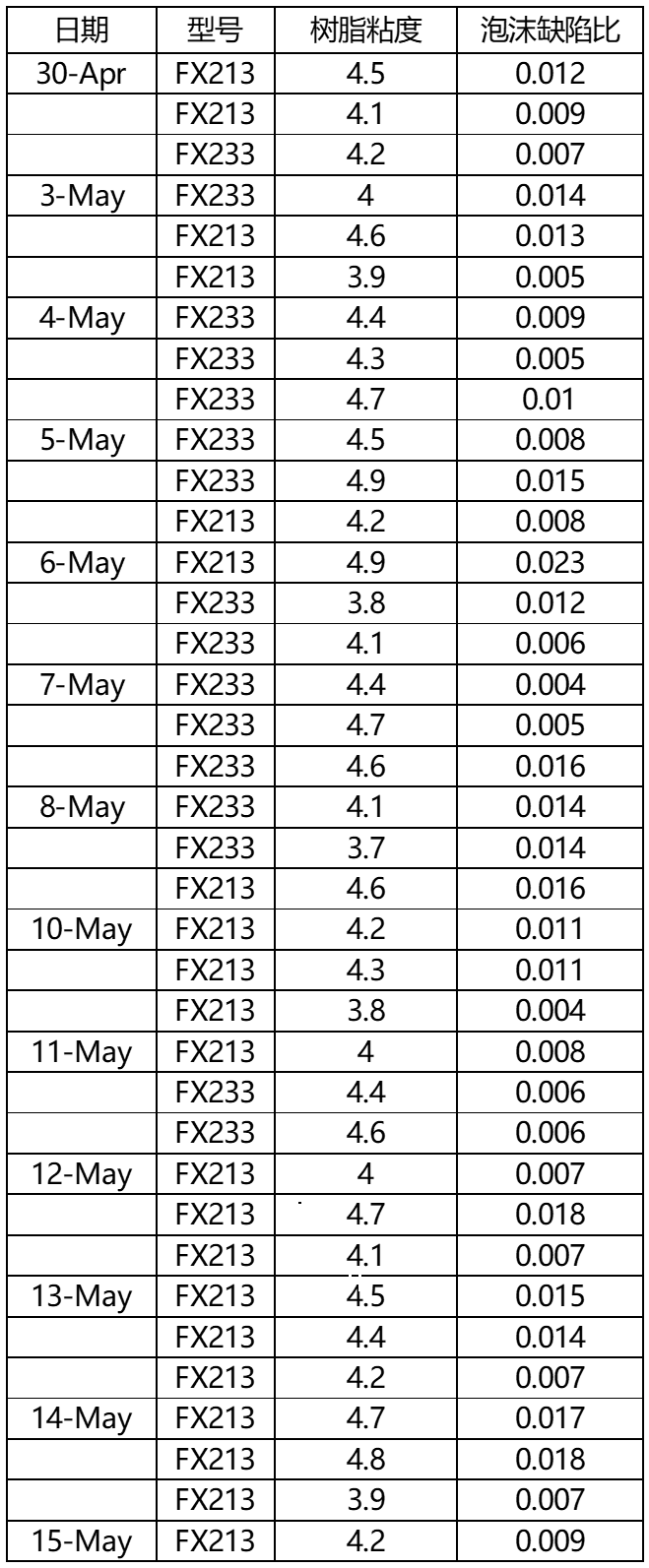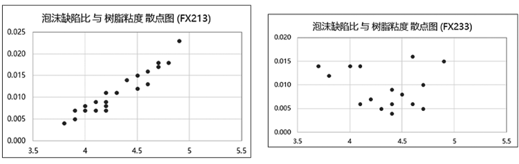 通过图形或分别计算的r值(FX213,r值为0.96;FX233,r值为-0.19),则得出的结论为FX213型号,泡沫缺陷比与树脂粘度成强正相关;FX233型号,泡沫缺陷比与树脂粘度成非常弱的负相关。