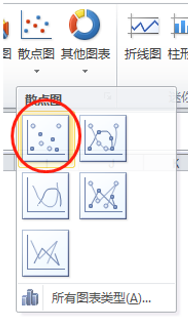 3.2 选择散点图下拉菜单的左边第一个图形,如下: