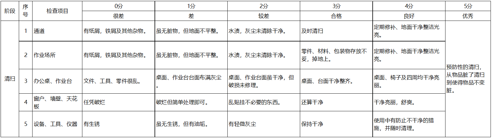 •   定义:从里到外地清除现场中的所有灰尘、污垢和油渍;清扫时,要进行检查,防止污染的发生。