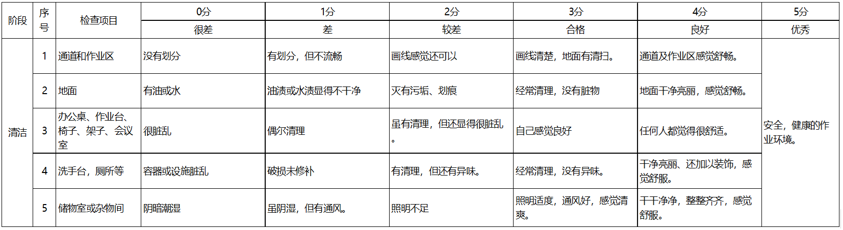 •   目的:a. 保持安全、干净、明亮的环境 ;b. 确保工作场所的物品处于良好的状态,稳定质量 。