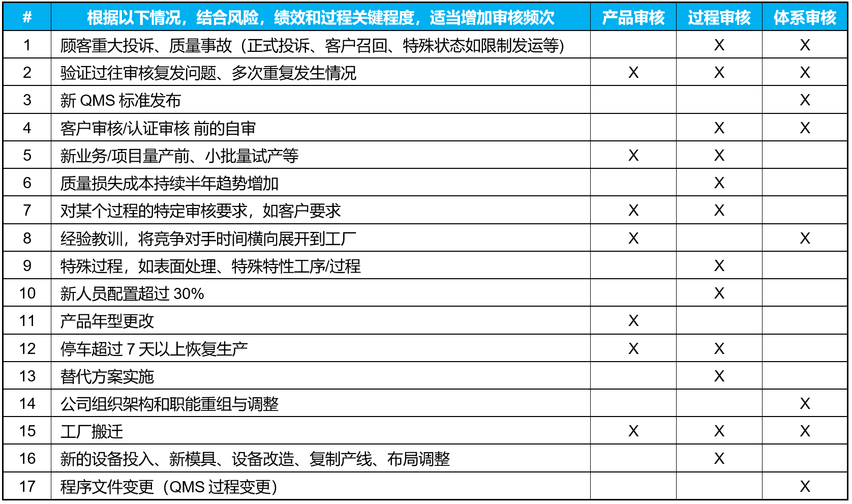 【提示】内审方案可以是任何企业自行定义的格式,信息尽可能策划完整。审核优先级(针对增加的审核)建议采用矩阵格式,如: