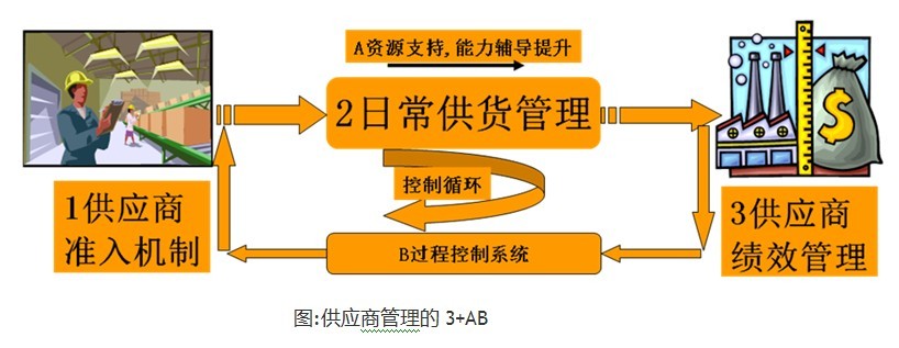 因而,要想做好供应商管理,一定要从结果导向的绩效拉动模式以及全过程角度来思考, 基于对不同类型企业辅导过程的最佳实践,提出供应商管理3+AB 模式,如附图: