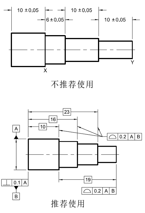 2)明确表达了推荐和不推荐的标注方法。如:采用直接公差(线性公差)标注的方法来表达位置(无论是表面还是尺寸要素的位置),一律建议用轮廓度或位置度,如下图: