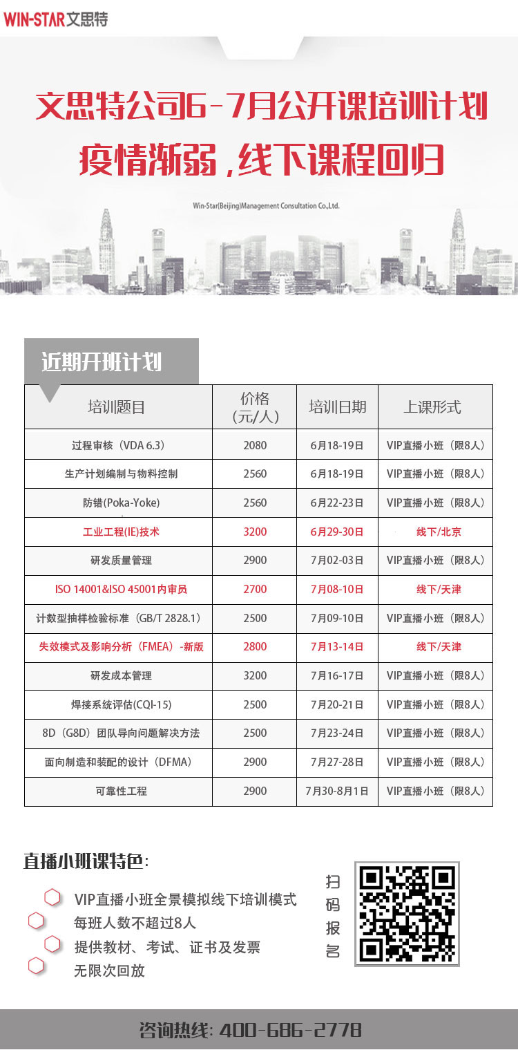 6~7月公开课计划已更新,实验设计(DOE)、供应商质量管理、质量成本管理(COQ)、过程审核(VDA6.3)、防错(Poka-Yoke)等众多课程等你选,赶紧扫码占位吧!