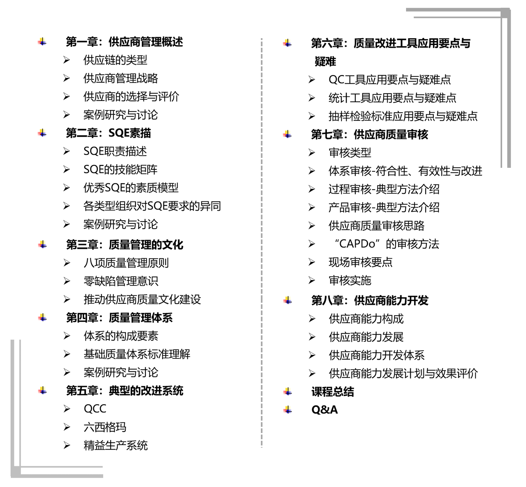 参加对象:本课程主要适用于需要提升供应商质量管理技能的供应商质量管理经理、主管、工程师。