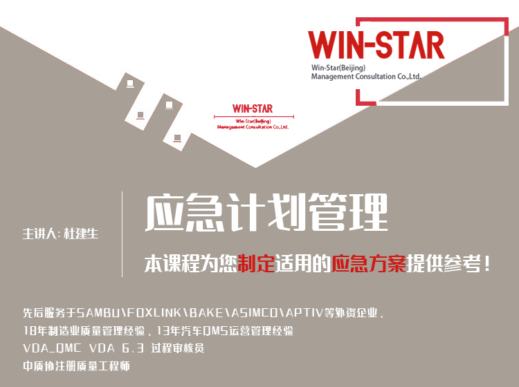 本课程适合应急计划的管理职能人员,包括人事管理、制造管理、物流管理、设备管理、IT和供应链,以及体系工程师、内审员等相关人员。