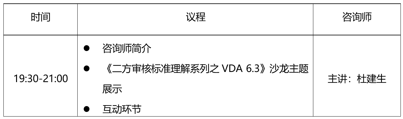 助力企业朋友们更深入了解新版VDA6.3过程审核的内容、掌握有效运用VDA6.3过程审核的方法。