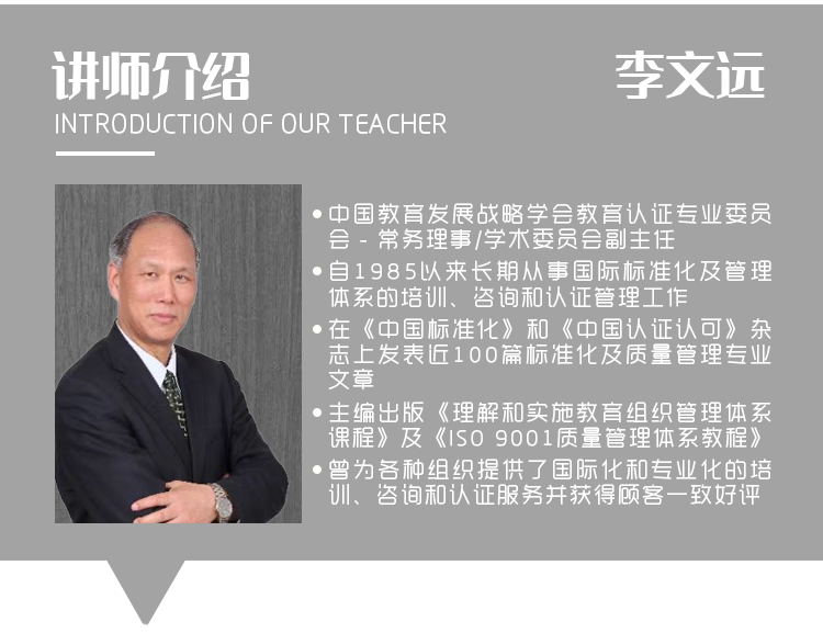 本课程专为教育组织各级管理人员所开发,旨在使其理解ISO 21001教育组织管理体系国际标准的目的、原则、意义、要求和方法,在建立、实施、保持和持续改进教育组织管理体系中发挥强有力的领导作用,从而使教育组织获得良好的社会效益和经济效益,并实现高质量可持续发展。