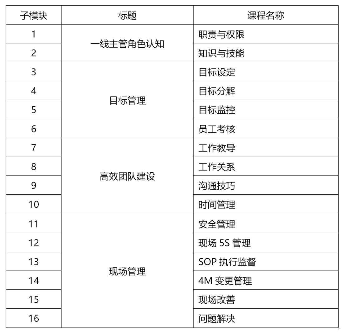 文思特公司的一线管理者能力模型将一线管理者的能力分为四大模块、十六项关键能力,首先帮助一线管理者明确其角色定位,进而培养一线管理者的目标管理、现场管理、高效团队建设能力,全面提升一线管理者的综合素质,确保其有能力“指挥战斗”。