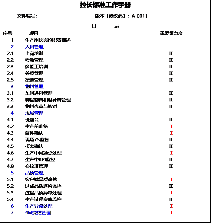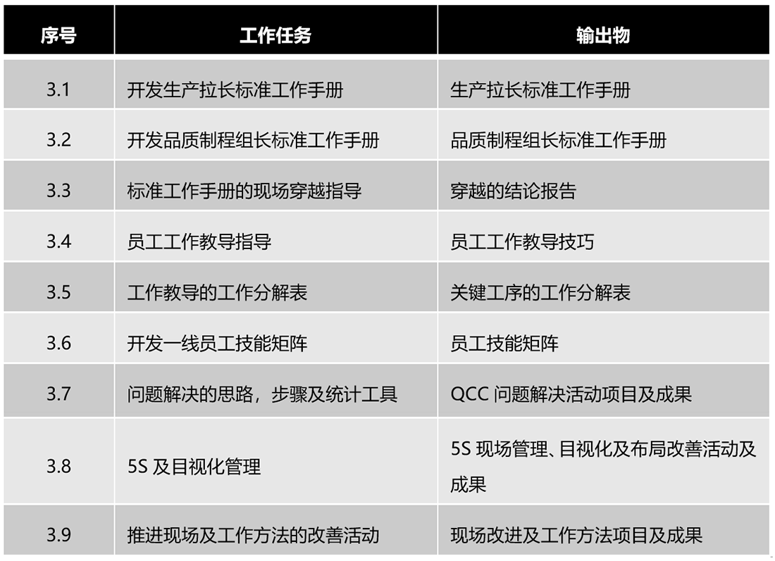 6.1 完成生产拉长、品质制程组长的标准工作手册并穿越运行,紧贴工厂运行中对拉长、组长的基本要求: