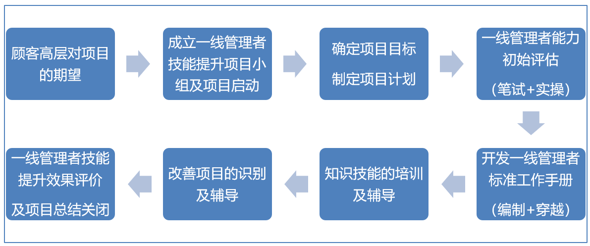 本咨询项目以文思特公司一线管理者能力模型为理论基础,通过对一线管理人员的初始能力评估-理论知识培训-实际技能指导与训练-改善项目辅导-能力再评估等一系列步骤,提升和强化一线管理者能力。