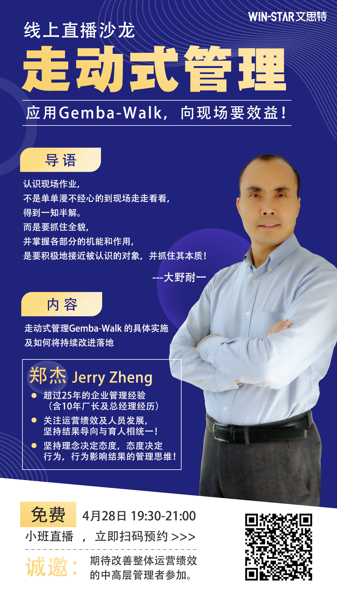 如果您对提升运营绩效感兴趣,如果您在生产管理中有困扰,欢迎您来参加《走动式管理Gemba-Walk》线上沙龙,与资深咨询师一起来讨论!