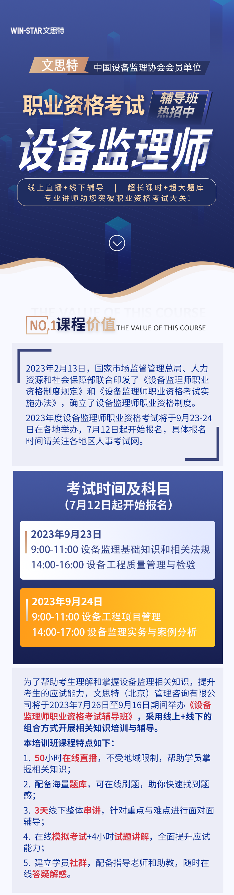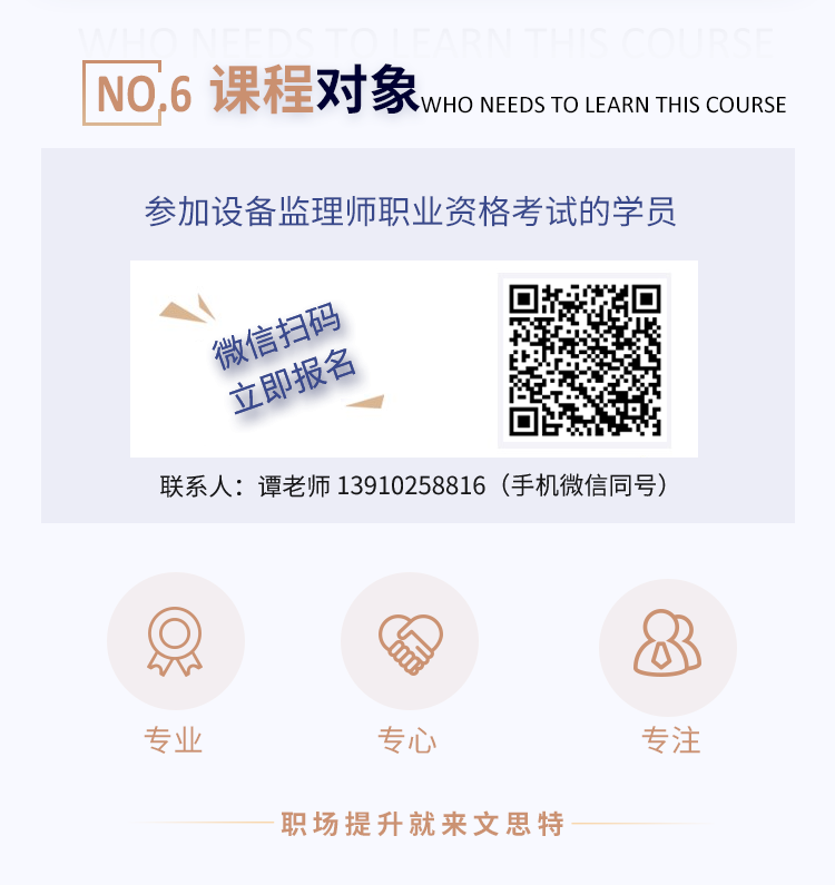 为了帮助考生理解和掌握设备监理相关知识,提升考生的应试能力,文思特(北京)管理咨询有限公司将于2023年7月26日至9月16日期间举办《设备监理师职业资格考试辅导班》,采用线上+线下的组合方式开展相关知识培训与辅导。