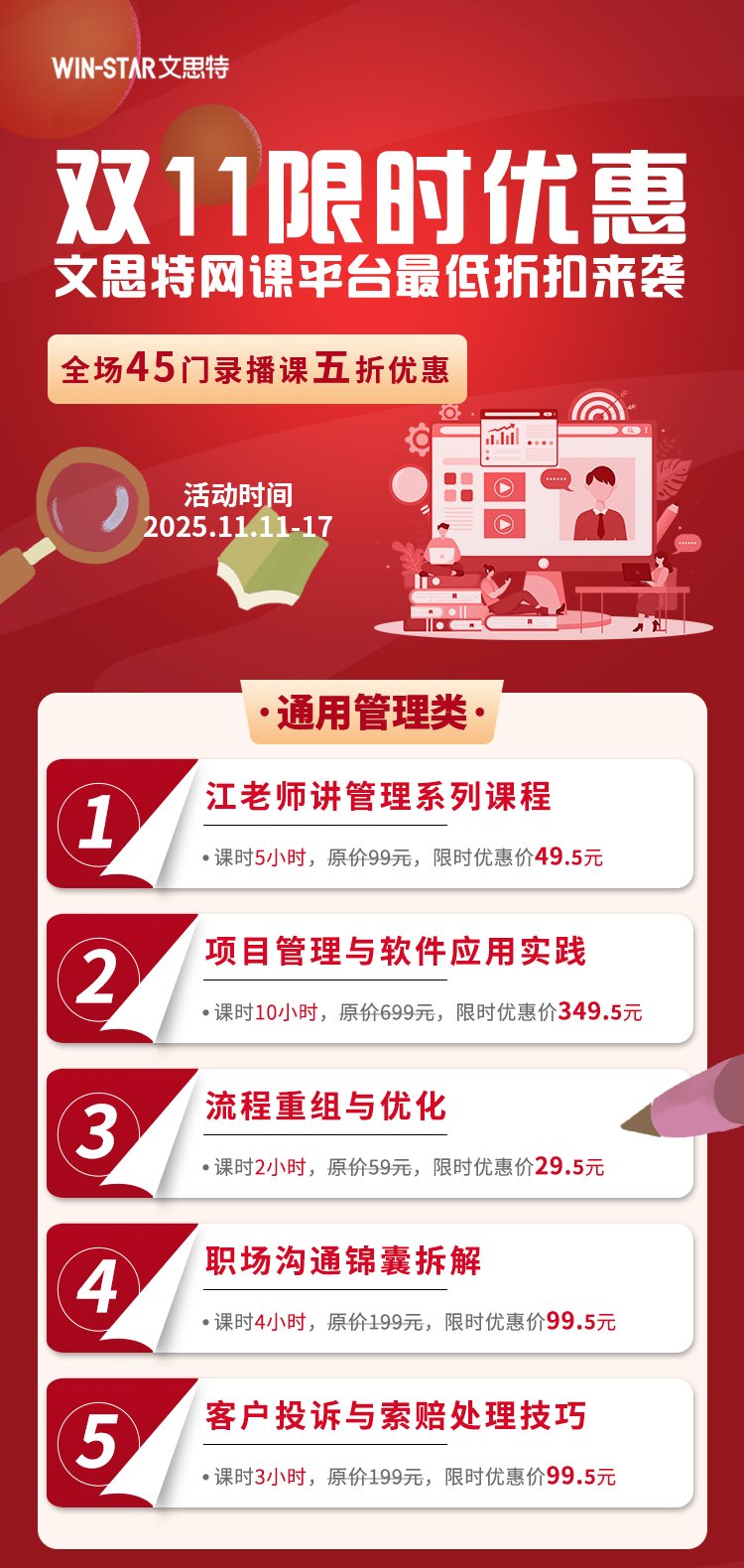 双十一限时优惠-文思特网课平台最低折扣来袭-全场45门录播课五折优惠